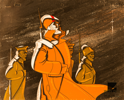 На выставке представлены копии эскизов и рабочих материалов к советским анимационным фильмам, посвящённым Октябрьской революции и Гражданской войне: "Орленок" (реж. - В.Бордзиловский, худ. - В.Тарасов, 1968), "Сказка о Мальчише-Кибальчише" (реж. - А.Снежко-Блоцкая, худ. - Корнеев Б.Д., Рудаченко М.Я., 1958), "Песни огненных лет" (реж. - И.Ковалевская, худ. - И.Урманче, 1971), "Вперед, время!" (реж. - В.Тарасов, худ. - Н.Кошкин, 1977), "Горячий камень" (реж. и худ. - П.Саркисян, 1965), "Песня о юном барабанщике" (реж. - В.Котеночкин, худ. - С.Русаков, 1972) и другим.