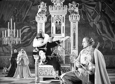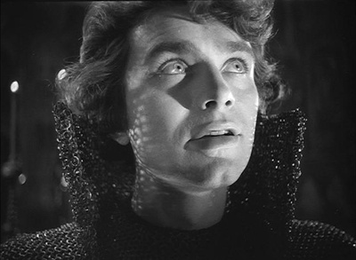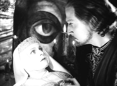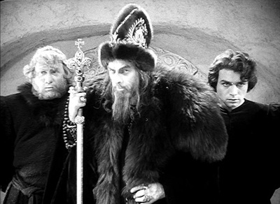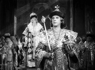 В 1940 г. Эйзенштейн задумывает фильм об Иване IV, сценарий которого дописывает к весне 1941 г. Студия "Мосфильм" утверждает проект незадолго перед началом войны между СССР и Германией. На студии видят в этом новую возможность - после Александра Невского - разжечь в людях патриотизм. Съемки начинаются 1 февраля 1943 г. в Алма-Ате: война не позволяет снимать фильм в Москве. вторая серия снимается на "Мосфильме" в сентябре-декабре 1945 г.; в нее включены цветные сцены, снятые на трофейной пленке "Agfa", захваченной в Германии в конце войны. Первая серия выходит на экраны в январе 1945 г., пользуется большим успехом и получает Сталинскую премию. Монтаж второй серии Эйзенштейн заканчивает в феврале 1946 г. Болезнь и официальный разгром второй серии не дают ему приступить к съемкам третьей части, хотя сценарий уже тщательно прописан и подготовка проведена. Напомним, что в третьей серии Иван, выступая в союзе с Англией, должен был вступить в победоносное противоборство с ливонскими войсками. Курбский погибал в замке, который взорвал его приспешник, чтобы не дать беглому князю попасть в руки врага. При этом взрыве погибал также Малюта. Фильм должен был заканчиваться речью Ивана, утверждающего, что отныне русские будут владеть Балтикой. Лишенная всякой исторической достоверности, заключительная часть трилогии приписывала Ивану победы, одержанные гораздо позже Петром Великим.