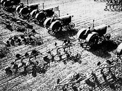 В Старом и новом (1929) Сергей Эйзенштейн блеснул "балетом тракторов" - нарезая борозды "кругами", они выписывали на пашне ненужные земледелию, но эффектные для экрана конструктивистские композиции. В схему этого кадра Медведкин внёс озорную мотивировку, снижающую высокие абстракции Эйзенштейна: в поле, прямо на расстеленной салфеточке, стоит бутыль с водкой, а тракторист катается вокруг неё, борясь с искушением. Эту приманку для нестойких граждан выставил неугомонный вредитель - понятно же, что народ пьёт не сам по себе, а исключительно по наущению агентов империализма.