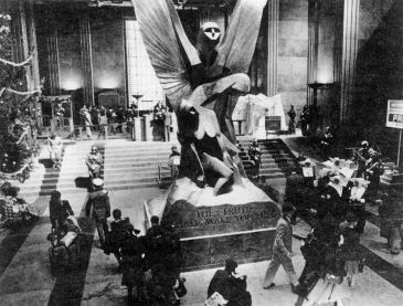 Не так много, как вы думаете. Мне интереснее менять натуру — хотя бы потому, что тогда в кадр попадает больше реальных вещей. Наши основные декорации, например огромное фойе министерства, строились на студии "Ли" в довольно небольшом павильоне. Мы старались особенно не тратиться, брали листы ДСП метр двадцать на два сорок и красили их под мрамор — тем же методом, каким делают мраморную бумагу. У нас был огромный покрасочный резервуар с водой, на поверхность наливали масляную краску, макали туда листы ДСП и тут же покрывали их блестящим лаком; все помещение сделано из таких листов. Все это строилось по типу сценических декораций, все видимые предметы представляют собой задники — только расписанные с обеих сторон, плюс квадратные колонны по двум сторонам куба. Когда камера поворачивалась, чтобы снять сцену с другой точки, мы просто разворачивали всю декорацию целиком. Так можно сэкономить очень изрядную сумму — плюс многие вещи мы использовали по нескольку раз, что тоже приятно. Например, фойе отдела сбора информации — это та же самая декорация, что и само Министерство информации: фойе номер один, для публики, было украшено статуями; когда мы их убрали, получилось второе фойе. Поэтому возникает ощущение, что ты уже здесь был, чувствуется что-то знакомое и вместе с тем незнакомое; мне нравится сама идея выдавать одно и то же место за два разных в зависимости от настроения в той или иной сцене.