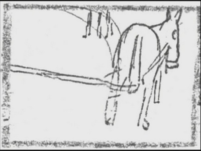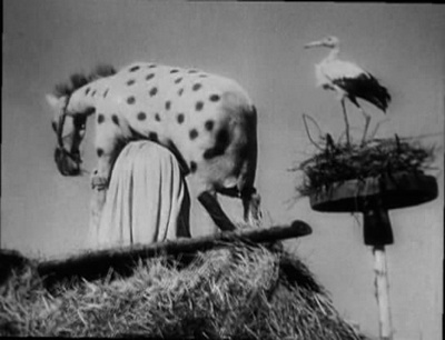 Счастье /1934/, Медведкин опубликовал в журнале "Кино" в 1933 году очень любопытную статью, называвшуюся "Новая форма драматургии". В ней говорилось: "Русские лубки, басни и сказки о "жар-птице", о богатстве и бедности, о "скатерти-самобранке", одиозные русские фигуры жадного попа, конокрадов, мироеда - все это "сродни" сценарию "Стяжатели". Однако глубоко неправы те товарищи, кои, защищая сценарий, определяют его как лубок, сказку, басню или эпопею. Фильма значительно сложнее, чем любое из этих определений. Черпая материал из фольклора, фильма приемом гиперболы перерабатывает его в реалистическую концепцию. Гипербола - основной прием обработки материалов от начала до конца фильмы".