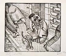 Нацистская пропаганда изображала увечья как своеобразную норму и прославляла некое возвышенное состояние духа инвалидов - экспрессионисты же показывали телесную ущербность как аномалию, именно убивающую духовное начало Их персонажи были словно искусственными - они казались "собранными" из различных частей, скреплённых шурупчиками и проволочками, и человек становился не то придатком своего протеза, не то - его продолжением. Он превращался в неодушевлённый предмет, буквально - в предмет, лишённый души. На диксовского "Продавца", как на столбик, писает смешная, словно забежавшая сюда из мультфильма, такса.