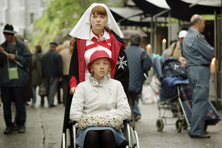 Несмотря на то, что окружающий мир, и в особенности Интернет, кишит рецензиями, выбалтывающими важные фабульные повороты этой превосходной картины (взять хотя бы симпатичную в целом статью Елены Плаховой с крайне, однако, жесткими спойлерами), Лурд – не тот случай, когда хочется пересказывать сюжет. Из всего синопсиса наперед достаточно знать, что последний фильм Джессики Хауснер ( Отель, Милая Рита, Интервью) посвящен группе пилигримов, большей частью инвалидов, под патронажем сестер милосердия и гвардейцев Мальтийского ордена прибывших в знаменитый город, прославившийся многочисленными визитами Богородицы к одной его юных жительниц в середине XIX века и регулярными с тех пор чудесными исцелениями, тщательно регистрируемыми католической церковью. И в этом живописном, хотя и многолюдном уголке, где архитектурные красоты базилик и церквей немногим уступают горным пейзажам Верхних Пиренеев, Хауснер сняла, казалось бы, очень частную историю, незаметно вырастающую в воздушную притчу о чуде, одиночестве и нелюбви.