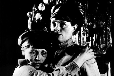 Октябре его лирическое волнение явственно окрашивает изображение именно "ударниц", а не, скажем, большевичек: блистательная и эмоционально пронзительная монтажная фраза, где одна из них, тоскуя об утраченной женственности, поднимает глаза к скульптуре Родена "Поцелуй" - воспринимается как истинное лирическое стихотворение на плёнке.