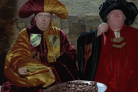 Кентерберийские рассказы). В фильме Чосер предстает зрителям смешным подкаблучником, который оттягивается в своем разудалом воображении, где монахи и монашки, отцы семейств и замужние дамы, а также юные девы и студенты предаются любовным утехам, в том числе групповым. Тут пожилой супруг умирает, истощившись в сексуальном марафоне, но и на последнем дыхании подает знак "Хочу еще!". Старик женится на молодой девушке, но вскоре слепнет, а у женушки тут же появляется молодой любовник. Кардинал подсылает своего человечка, чтобы шпионить за прелюбодеями и шантажировать бедолаг; кто побогаче – откупается, а бедный идет на костер. Повару снится, как вокруг него танцуют и резвятся обнаженные девицы. Двое оголодавших на монастырских хлебах послушников, нанимаясь к мельнику таскать мешки, чтобы малость подкормиться, ночью, под храп хозяина заваливаются в постель – один к его жене, другой – к дочке. Все, что идет от тела, не грешно и не зазорно: секс с кнутом – не страшно, если это доставляет удовольствие обоим партнерам, а помочиться в трактире с галереи на народ – просто веселое невинное озорство: "Я посланник господа, и это – лучшее вино, вы ничего лучшего не пили!". Между прочим, обливание мочой имело в те времена совсем не то унижающее значение, что теперь. У французов бытовало присловье "Если бы бог здесь помочился", что подразумевало особенную благословенность; моча и испражнения непосредственно связывались с оплодотворяющей силой, обновлением, благополучием. Соответственно, в этом эпизоде нет вульгарности, грубости, непристойности – дело житейское. Соответственно и смерть в момент совокупления – всего лишь превращение ее в смешное страшилище, приручение ее. Как писал Михаил Бахтин, "Гротеск, связанный с народной культурой, приближает мир к человеку и отелеснивает его, ородняет его через тело и телесную жизнь". Это потом образы материально-телесной жизни – еда, питье, испражнения, совокупление утрачивают свое естественно-природное значение, и их начнут стыдливо избегать…
