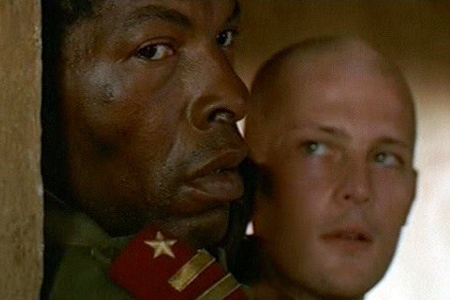 Белый материал как будто напрашивается на гибель. Хаос, сгущающийся вокруг плантации, и так неминуемо захлестнет ее, но любимый сын Марии, рыхлый юноша-вырожденец, в один момент окончательно слетевший с катушек, сам приводит в свой дом повстанцев, где истекает кровью их предводитель по прозвищу Боксер. Исполняющий эту небольшую, но важную роль Исаак де Банколе – харизматичнейший африканец, наиболее памятный по фильмам